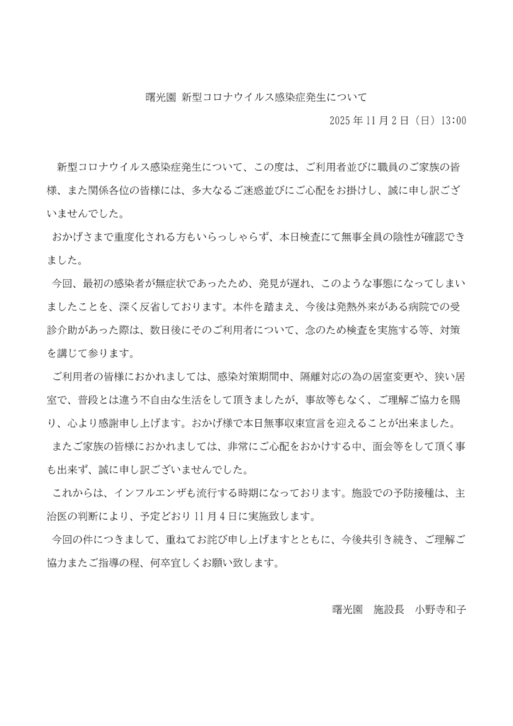 【収束宣言】曙光園 新型コロナウイルス感染症について(第18報)(11/2(日)13:00)