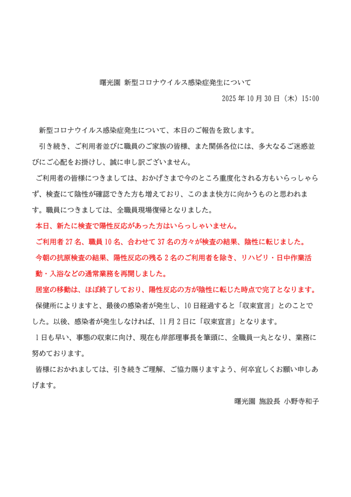 曙光園 新型コロナウイルス感染症 発生のお知らせ(第15報)(10/30(木)15:00)