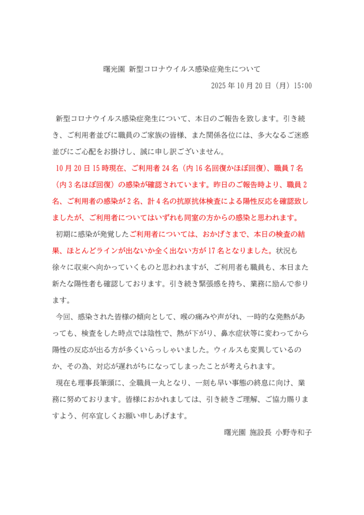 曙光園 新型コロナウイルス感染症 発生のお知らせ(第5報)(10/20(月)15:00)