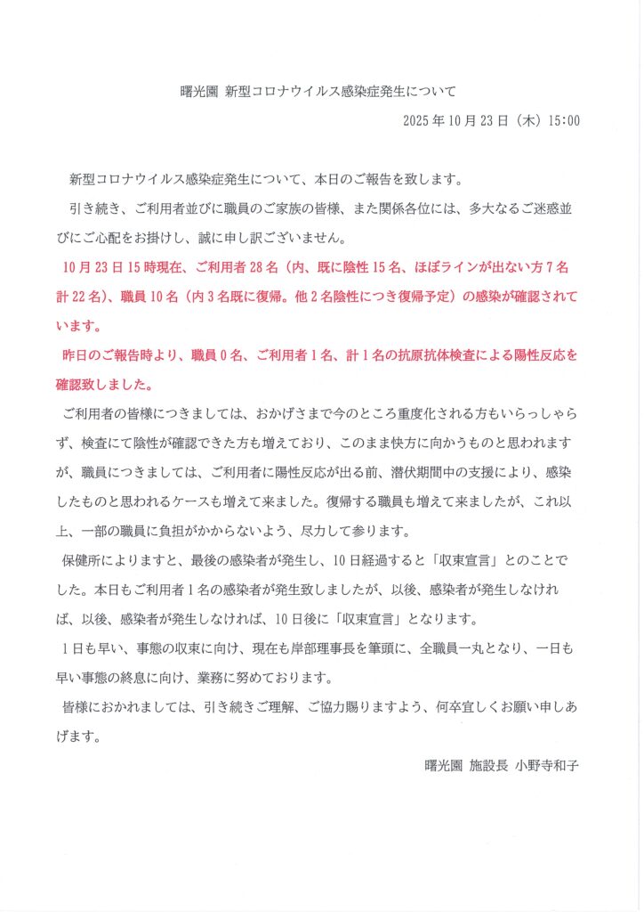 曙光園 新型コロナウイルス感染症 発生のお知らせ(第8報)(10/23(木)15:00)