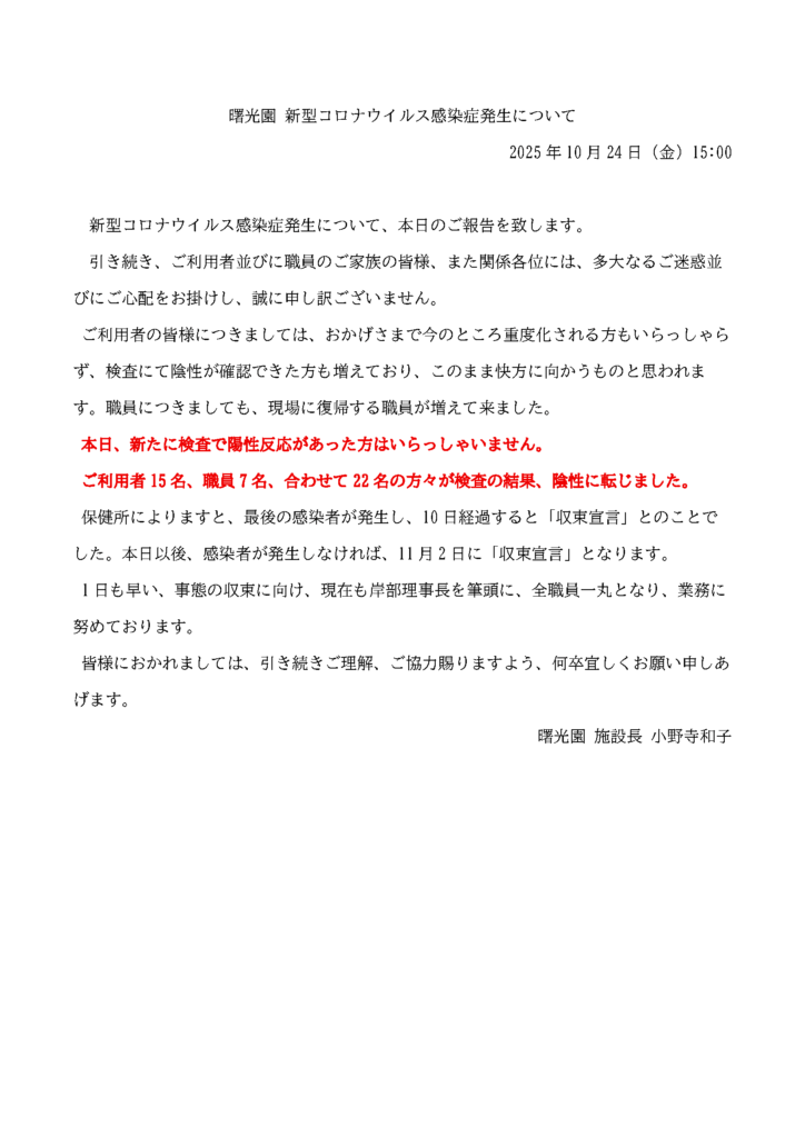 曙光園 新型コロナウイルス感染症 発生のお知らせ(第7報)(10/22(水)15:00)